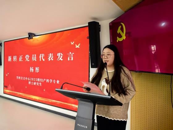 新转正党员代表、学科交叉中心2025级妇产科学专业博士研究生杨彤回顾了从递交入党申请书到正式入党的成长历程,并代表全体党员郑重表态,以实际行动践行入党誓词。