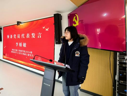 预备党员代表、国家卓越工程师学院2024级材料科学与工程专业硕士研究生李娇敏结合“工学交替”培养模式下的学习实践经历,分享了对中共党员这一光荣身份的认识。