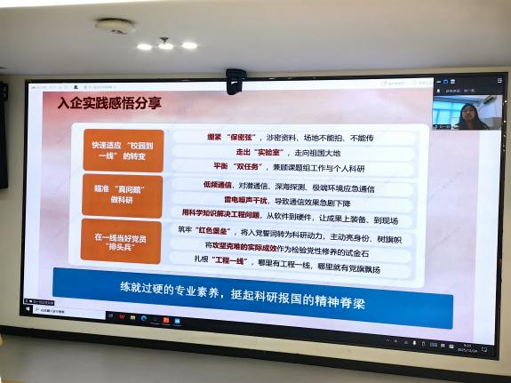 党员代表、国家卓越工程师学院2024级集成电路专业硕士研究生、卓越一支部党支部书记刘一苏在线上分享了入企实践的收获,鼓励研究生党员亮身份、树旗帜,将入党誓词化为科研动力,以攻坚克难成效检验党性,在产业一线当好“排头兵”。