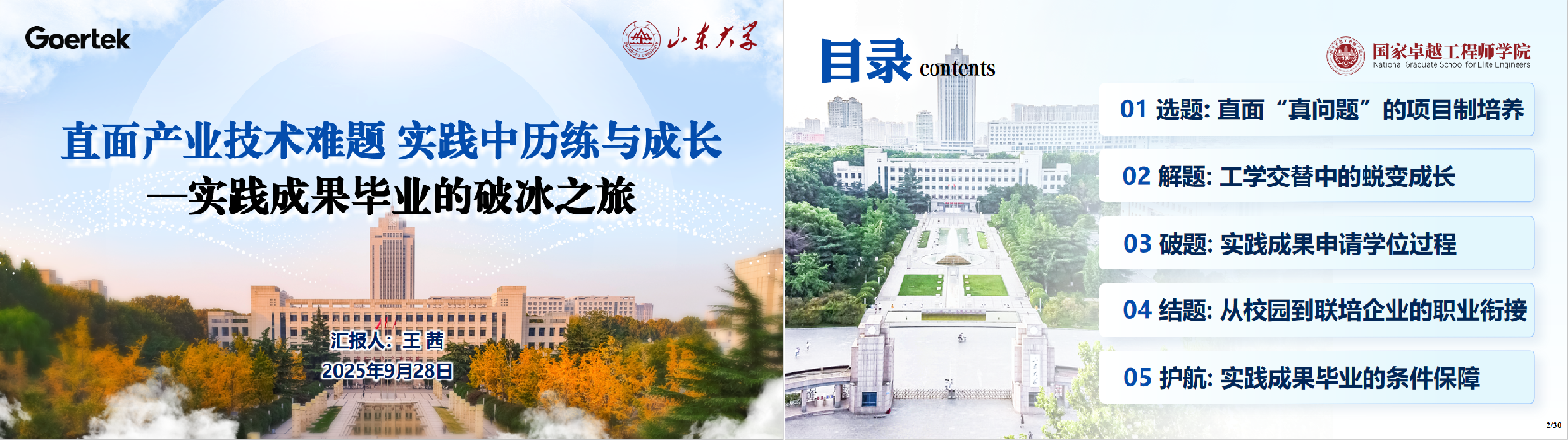报告以“直面产业技术难题 实践中历练与成长”为题,结合自身参与的关键技术研发项目,从选题、解题、破题、结题、护航五个方面展开,详细阐述了如何在校内导师与企业导师的联合指导下,将前沿理论知识与重大工程实践需求紧密结合,最终形成高质量、可应用的毕业成果。作为学院首届毕业生,王茜同学在山东大学、松山湖材料实验室与歌尔股份的共同培养下,以实践成果申请学位的成功案例,突破了“以毕业论文申请学位”的唯一标准,成为山东省首例,学校以此为契机成立了校企共建的合作平台:山大歌尔研究院、东莞松山湖平台等,充分展现了山东大学国家卓越工程师学院在创新人才培养模式、深化产教融合方面取得的扎实成效,更展示了我校在资源整合与校地企融合的创新实践,为后续学员的实践学习提供了宝贵经验。